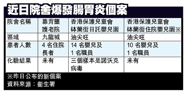 【本報訊】位於油尖旺區的香港保護兒童會砵蘭街日託嬰兒園,繼在上月爆發十多名幼童及一名職員染上諾沃克類病毒後,病毒疑擴散至二樓及三樓的住院嬰兒園,有十名住院嬰兒及一名職工不適,其中兩名嬰兒更要入院治療。衞生署估計今次的集體感染,是一名染病的日託嬰兒曾在住院部過夜所致。