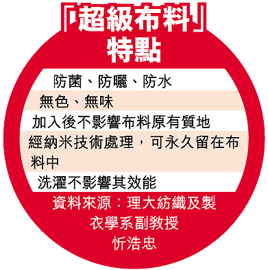 【本報訊】香港理工大學成功研究出全球第一種百分百防菌、防曬、防水的「超級布料」,且製造成本低廉,多個本地廠商已表示有興趣生產以這種「超級布料」縫製的「超級時裝」,並預計明年推出市場。 記者:呂焯均
