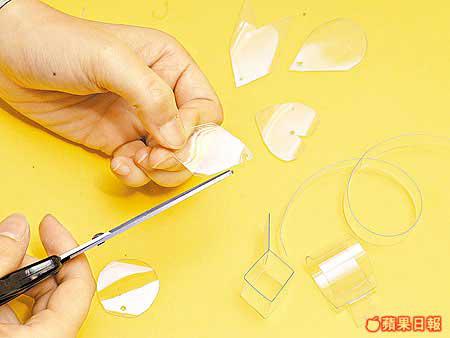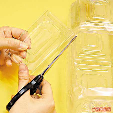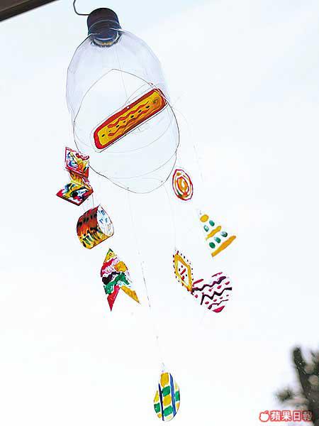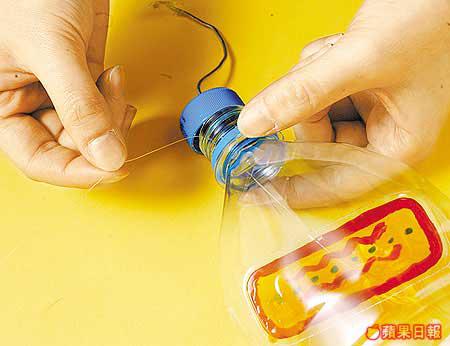 近來經常吹起陣陣季候風,既然還有剩餘膠樽,倒不如做個隨風搖曳的風鈴。用玻璃專用顏料在膠樽上繪圖,完成後竟有如玻璃畫同樣美觀的效果。膠樽風鈴也可發出聲響嗎?竅門是在樽嘴內掛一塊橫向的長形膠片,風吹過時便會發出輕微的「敲樽」聲。