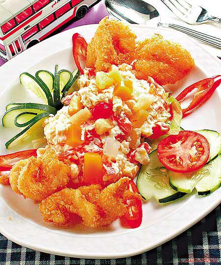 鮮雜果蝦球沙津:老闆稱這味菜很受歡迎,因為他們用的都是新鮮蔬果,鮮甜健康。而蝦球用上蝦仁,因此炸出來非一般圓形蝦「球」狀,而是如蝦「弓」般彎起,光看畫面已具美感。