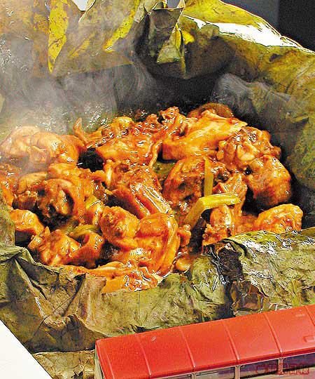 鮮荷鹽焗豆醬雞(半隻雞+飯+例湯+咖啡或茶):這味鎮店之寶用上鮮活雞,先將原隻雞醃製再風乾兩至三小時,師傅指這樣做雞的皮才會鬆脆。切成塊後配上秘製豆醬,用鮮荷葉及錫紙包裹焗半小時,未開封已聞到香噴噴的豆醬味。雞香豆香荷香溶入口中,肉質爽滑,啖啖惹味。