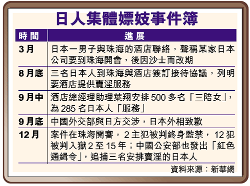 昨天在法庭內,十四名主犯穿上寫着「珠看(珠海看守所)」的橙色囚衣,在三十名法警戒備下出庭。法庭判詞指出,負責接待該日本旅行團的珠海國際會議中心酒店總經理助理葉翔,在日本人港邊功要求下,透過「媽咪」明珠串聯珠海市多家娛樂場所的「媽咪」,一夜之間網羅了約五百名「三陪女」。