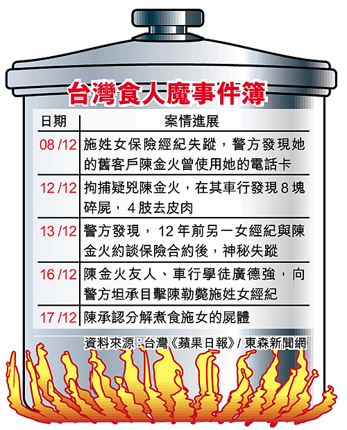 台灣出現「食人魔」!台中年輕女保險經紀日前慘遭殺害並碎屍八塊,涉案重大疑犯昨天更承認,他將女死者支解煮食。警方在凶案現場發現輕便裝氣體爐具,旁邊還殘留着懷疑是被害女子的肉碎,令人毛骨悚然。