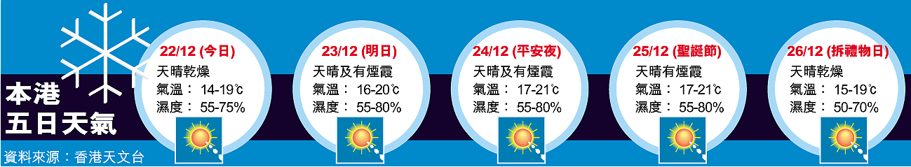 不過,市民今日還是要緊記加衣。天文台預測今日天晴乾燥,但晚間天氣清涼,市區最低氣溫預計只有十四度,新界再低兩、三度,最高氣溫則有十九度,吹和緩東北風。