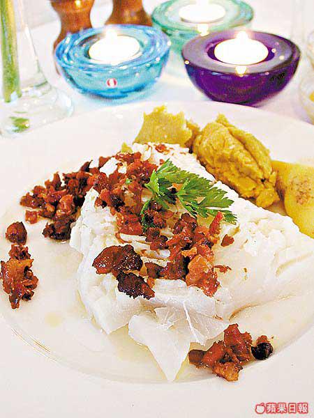 臨近聖誕,在侍應的推介下,我最後點了挪威北部人在平安夜必吃的Lutefish。這種魚其實是魚的魚腩部份,製法是先將魚灼至半熟,吃時再淋上用橄欖油炸至香脆的煙肉碎。