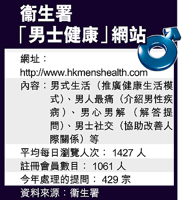 他又指,除男士外,不少關心身邊男士的女性,如太太及女朋友等,也會瀏覽網站及提問。有關網站去年共有十三萬人瀏覽,今年至今已升至四十七萬人。