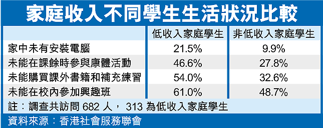 香港社會服務聯會於上月至本月,訪問了六百八十二名就讀小四至中三學生,當中包括三百一十三名低收入家庭學生(家庭月入四千元或以下),比較這批學生與非低收入家庭學生生活狀況。調查發現,只有四成低收入家庭學生有錢購買課外書籍,較非低收入家庭學生的近七成為低。此外,低收入家庭學生家中設有電腦的比率,也較非低收入家庭學生低逾一成。