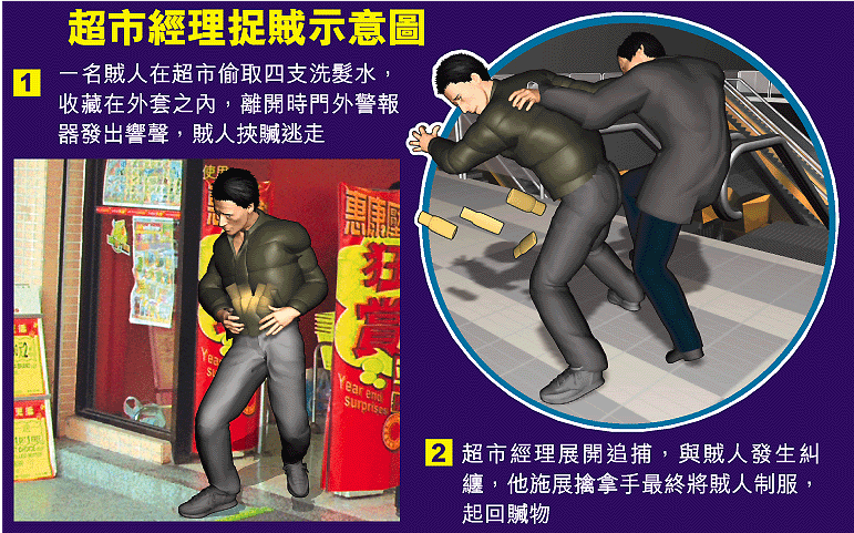 其時溫經理正在門口整理貨物,聞訊即將賊人截住,不料賊人發難逃跑,他沿扶手電梯向商場二樓飛奔,溫尾隨緊追不捨,但賊人向他揮拳襲擊,他的左手手腕更被抓傷,在追到商場二樓,兩人在地上糾纏,溫施以擒拿手將賊人制服,終於人贓並獲。