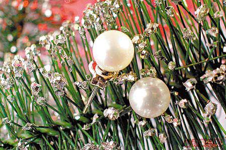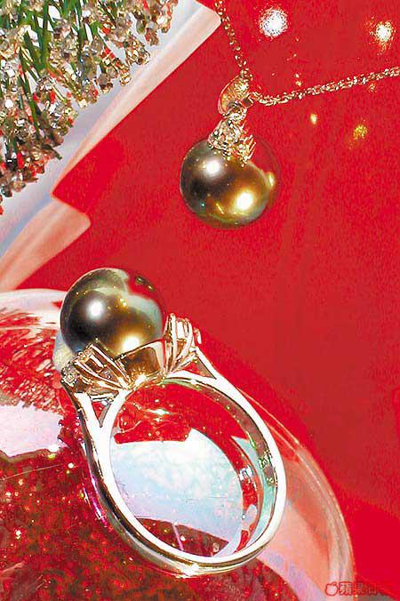 近年才較興的大溪地黑南洋珠,價錢大眾化,所以較受年輕一族歡迎。戒指用上9mm直徑的黑南洋珠,兩旁再鑲有6粒圓鑽襯托,吊墜則以三粒圓鑽鑲嵌,鑽石雍容優雅,黑色倍添貴氣,兩者互相輝映。