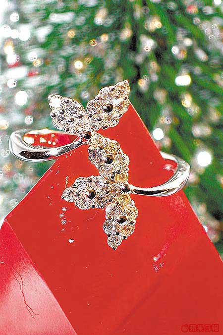 要數最能襯托聖誕節,首選這款葉子形鑽戒。六片葉有如聖誕花葉,每片都鑲上碎圓鑽,全隻共28粒,手工精細,外形纖巧中仍覺瑰麗奪目,即使襯CasualWear亦不失貴氣。
