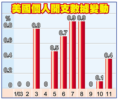 美國11月份個人收入升0.5%,勝過市場預期的0.4%;10月份收入由原先統計的升0.4%,修訂為升0.2%。個人開支在11月增加0.4%,差過市場估計的上升0.7%;不過10月份開支從原來的無升跌,修訂為增加0.1%。