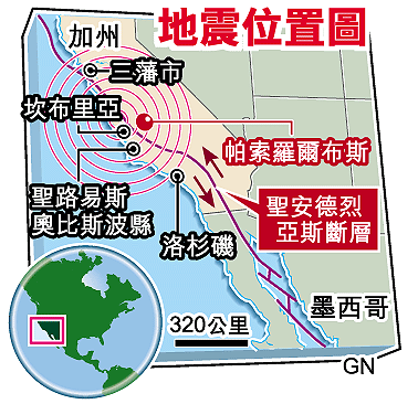 一場黎克特制六點五級地震,周一早上搖撼了美國加州中部海岸區,從三藩市至洛杉磯都受到強烈震動。重災區所在的一個小鎮,一棟過百年建築物倒塌,至少兩人命喪瓦礫下,約五十人受傷。地震亦令區內大停電,一個空軍基也被震得結構受損。