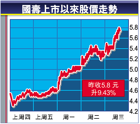 近期新上市的兩隻中資保險股及福建紫金(2899)繼續受到追捧,中國人壽(2628)上市後連升5日(見圖),昨日收報5.8元,再升9.43%。該股買盤強勁,上市後累積升幅達六成,昨日成交15.57億元,為交投最活躍的股份,佔大市總成交19%。人保財險(2328)及紫金亦分別升5.74%及4.39%,收報3.225元及5.95元,分別佔成交榜第3及第5位。3隻股份成交額共24.57億元,佔大市總成交30%。