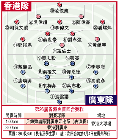香港足球代表隊今午在大球場上演的第二十六屆省港盃首回合出戰廣東隊,考慮到客軍以國內甲B廣州香雪球員為主力,實力平平,主隊士氣高昂,有望小勝。