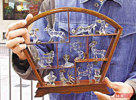 出年就係猴年,不如買番套用玻璃水晶及鍍金製成的十二生肖模型應應節。十二隻中國生肖動物放晒喺木架上,檔主為咗吸引市民購買,重送埋個木架並將十二隻生肖黏喺上面,一套齊齊整整,送畀人都唔錯。