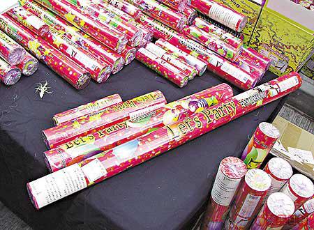 有特大、大、中及細共四款的彩色條炮,亦是派對狂歡的必需品。檔主話彩色噴條炮可以射到三層樓高,滿天碎紙的一剎那十分壯觀。玩法極似爆竹的彩色噴條炮只可使用一次,用完即棄。當日見到檔主不時射幾支上天,成條街的氣氛當堂High晒。