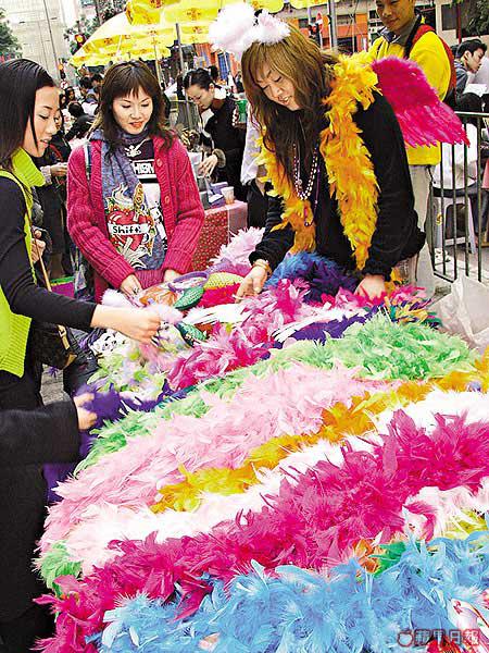 一條彩帶是最簡單又最搶眼的點綴品,呢個攤檔都有唔少款式任你揀,淺藍、紫、白、綠、黃等顏色應有盡有,戴上身可以裝飾襯衫之餘,包住條頸又夠暖笠笠,如果要買多種顏色的花色羽毛彩帶就要貴多10蚊。