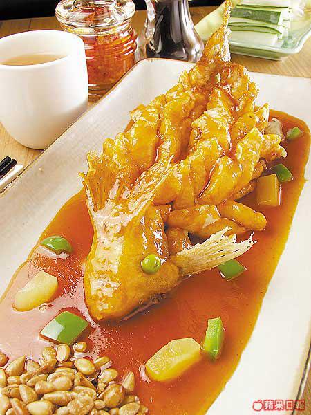 松鼠桂魚$78:這道蘇州傳統名菜,據說當年乾隆皇下江南,在蘇州松鶴樓吃了一道去骨鯉魚做成的松鼠魚,眉開眼笑,大為讚賞,自此松鼠魚聲名大噪。老闆改用桂魚,𠝹花炸熟後,澆上熱糖醋汁,吃在嘴裏外脆內嫩,酸甜可口。