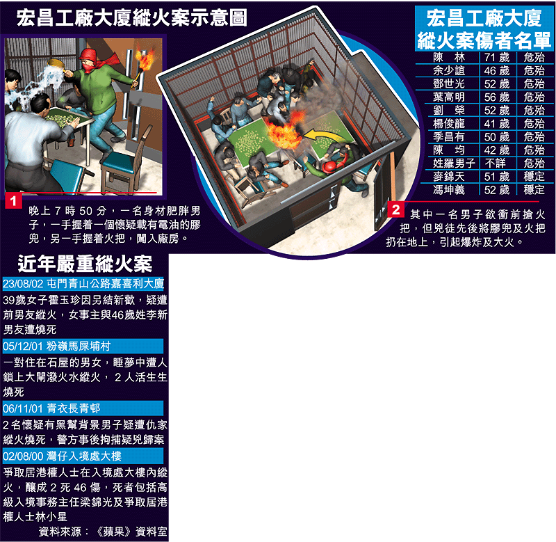 【本報訊】長沙灣荔枝角道宏昌工廠大廈內一間密封式地下麻雀館,昨晚遭人淋電油及擲火把放火襲擊,現場發生爆炸,十一名正在竹戰的男子及「塘邊鶴」(旁觀者),身陷火海。其中三人奪門而出,奔往樓下求救,另外八名來不及逃生的「火人」,則在濃煙密布的走廊及單位內慘叫嚎哭,驚動大廈內的廠戶報警。警員及消防員到場,將所有傷者送院後,九人情況危殆,兩人情況穩定。警方將案件列作縱火案,通緝一名涉案的兇徒歸案。 記者:黃偉民、林榮海、黎家駒、薛家傑