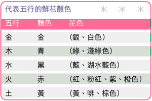 鮮花充滿靈秀之氣,因種植的過程中,吸收了大自然的日月精華,以及空氣、水份及土壤等的營養,因此風水上認為,若用五種顏色的鮮花沖涼,可洗去霉氣,快速地提升各方面的運勢。