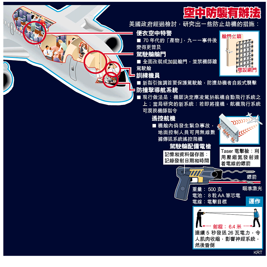 本周開始,美英航機上,如臨大敵,警衞森嚴。美國上周日發出第二高的恐怖襲擊警報,指阿蓋德陰謀劫機施襲後,美英兩國一同把航機保安升級。美國更要求外國航空公司在選定的往返美國航班上部署空中特警。英國亦首次宣布在一些航班上派駐持槍便衣特警。但兩國都沒有公布空中特警守衞的航班編號。