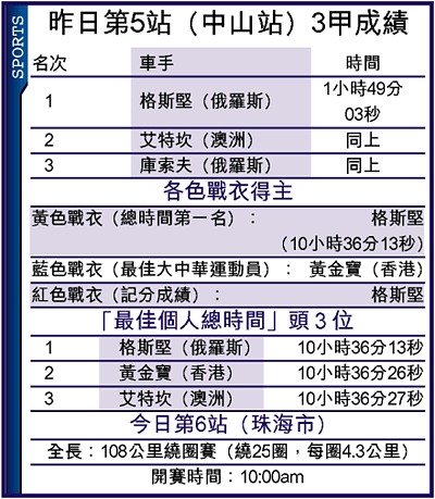 說回昨日的比賽,港隊主將黃金寶大部份時間困於主車群,與總時間接近的「黃戰衣」格斯堅及「紅戰衣」艾特坎在比賽中互相牽制;所以整整二十二個圈當中,也們三人不時走在一起。最決定勝是最後一圈的衝刺,格斯堅憑着整隊實力相若的隊友協助下,連續奪得兩站冠軍(亦是他在五站中第三個冠軍)。悉尼奧運金牌艾特坎則得第二名。阿寶以第十二名衝線,仍穩奪藍戰衣,總時間排名榜暫列第二位,同第三位的艾特坎只有一秒之差。