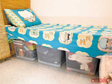 跟住兩年前我哋就決定租一個大啲嘅地方,有600呎,地方實用好多,有第一次嘅經驗,我就決定唔要咁多家具,咁就有多啲地方放嘢。」別人上屋搬下屋,都是「唔見一籮榖」居多,但Micson就多了好多雜物,於是決定放棄電視地櫃,索性將幾個不常開的雜物箱拼埋,蓋上一塊布,上面放電視,這個做法,慳好多地方。