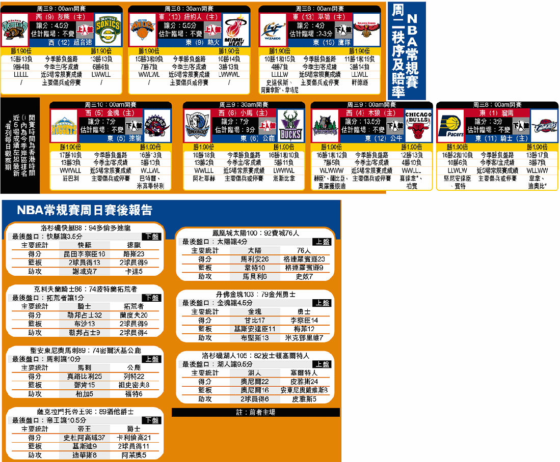 為防守最佳球隊的溜馬,近期在進攻上有退步迹象,在季初的十四勝二負戰績中,他們佔了十戰從快攻中獲得雙位數得分;但近十五仗,這情況僅發生兩次,尤其面對對手的聯防顯得束手無策,今仗作客年輕快速的騎士,佔不了便宜。