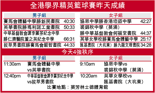 體藝將與以十七分輕取瑪利諾工業書院的英華書院爭入決賽;下線方面,上屆亞軍毅智書院雖有高榮生攻入二十分,但仍以十一分不敵實力平均的拔萃男書院,男拔萃與大熱門譚李麗芬紀念中學在四強碰頭。