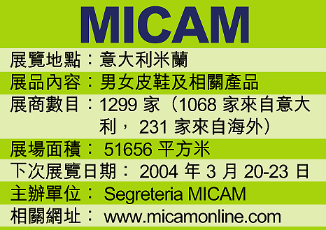 全球最大型的鞋展MICAM,在意大利米蘭一連4天舉行,吸引逾千展商參展,市場以百億港元計,但因為經濟不景,造成全球鞋業銷售數字倒退,展會內的競爭更形激烈,為了保持優勢,大部份參展商都刻意將展場搭建成堡壘一樣,入內洽商都要先行登記,不少更謝絕拍照採訪,以免最新設計洩漏於對手眼前。