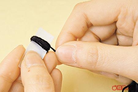 剪1塊1.5×3cm卡紙,然後用黑色繡花線於卡上繞圈20次,取出線圈後於中間打結,這便做好1個縫在馬仔頭頂的小繩球。