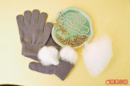 材料:冷手襪1對$10、金色膠珠1包$2、仿鑽石1包$10、扣針1個$1、棉花1包$5