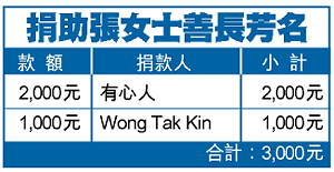 四十歲的張女士,因丈夫失業多月經濟陷困,早前面對被催交欠租、電費及煤氣費困境,一家四口連三餐也成問題,生計堪憂。張女士一對兒子現年八歲和十一歲,分別就讀小學二年及六年級。 蘋果日報慈善基金曾撥款六千元,助張女士解決經濟困難。 日前,記者另將一筆合共三千元的讀者捐款,轉交她簽收。 捐款編號:C1168 暖流熱線 電話:29908688 傳真:23702192 電郵:[email protected] 網址: http://www.charity.atnext.com