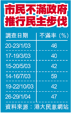 另外,港大民意網站調查顯示,公眾對政府推行民主步伐滿意率下跌兩個百分點至只有兩成,不滿率則上升五個百分點至四成七,對港府處理與中央政府關係的滿意率更劇跌十個百分點,民意研究計劃主任鍾庭耀指與政改問題有關。