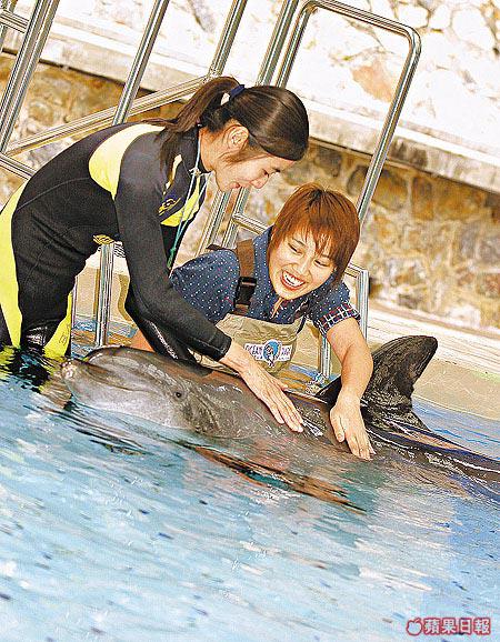 4條受過專業訓練的寬吻海豚Mini、Molly、Toto和Popeye輪流當值,每次活動只有1條海豚出場,今天主角就是19歲的海豚仔Mini,Lin與Blanche先餵魚,與Mini熟絡一番。