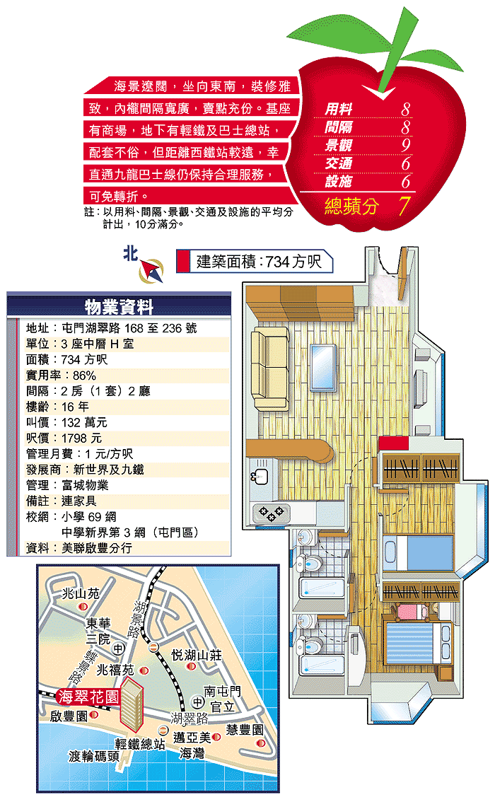 介紹的海翠花園3座中層H室,大廳向東南,海景開揚,內櫳裝修則是最雅致「省鏡」的一個。