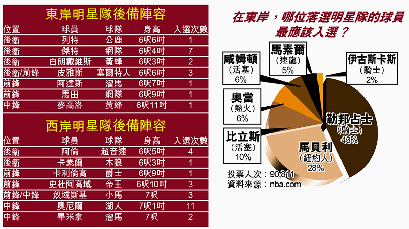 另外,一眾明星賽常客如網隊後衞傑特,以及湖人中鋒奧尼爾亦一如所料入選明星隊後備陣容。東岸明星隊將由溜馬教練卡里斯利統領,西岸則由木狼教練桑達斯執掌。兩軍將於香港時間本月十六日在洛杉磯決一雌雄。