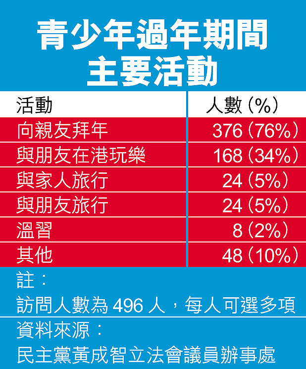 【本報訊】一項調查發現,有九成四青少年在農曆新年期間和家人吃團年飯,其中八成人表示這是家人規定。不與家人吃團年飯的青少年則認為這是沒有必要或不喜歡與家人一起吃飯。同時,四成青少年會和家人逛花市。負責調查的民主黨青年政策發言人黃成智,建議家長可以趁農曆新年增加家庭活動,增進感情,並可了解子女的新年大計。