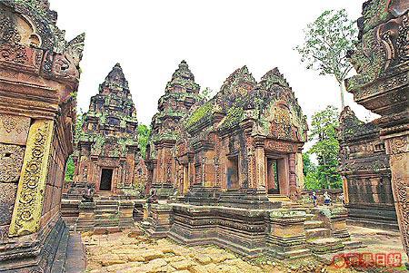 暹粒眾多寺廟之中,BanteaySrey可算是最古老的,它建於十一世紀,至今已有一千年歷史,可是發現的時間卻十分遲,在1914年。BanteaySrey的意思大約是「女性之鄉」,這座寺廟雖然細小,但寺內用粉紅色砂岩做成的雕刻卻細膩逼真,大部份都是描繪印度教的神話故事,反映高棉在當時國勢強盛,文化也高度發展。BanteaySrey距離暹粒足足一小時車程,三個人合租一輛的士要US$35。