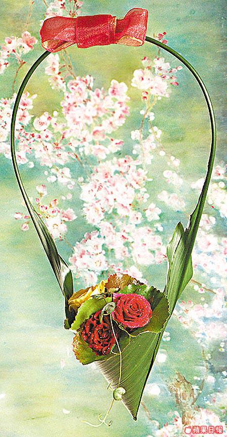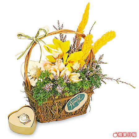 巧妙地用葉蘭做成小型吊盆,盛載着四朵黃、紅玫瑰,在加力士葉襯托下,外形精巧細緻,必能給她一個意想不到的驚喜。(最少四日前預訂,只限做三束)