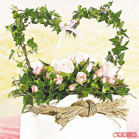 用上八朵大CandyBianca及數朵迷你Lydia荷蘭粉紅玫瑰,加入小象耳配襯,放在以Ivy葉砌成的心形花籃內,設計盡顯心思。(最少四日前預訂)