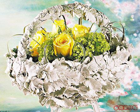 以蘱蘭砌成如手袋的花籃,內裏載滿白妙菊、繡球及黃玫瑰,蘱蘭有如鋪上一層雪霜,培添浪漫!(最少四日前預訂,只限做三束)