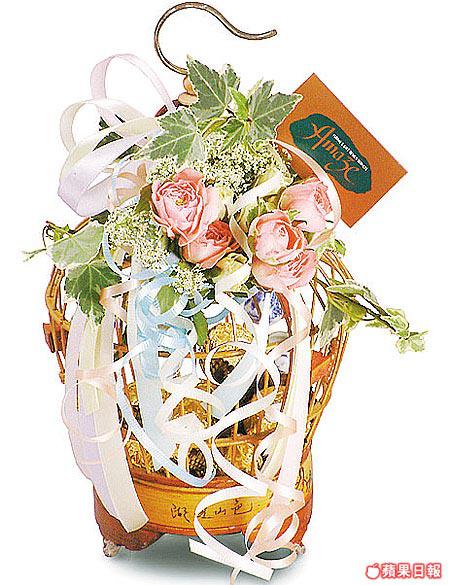 載滿金莎朱古力的中式雀籠,布滿五朵粉紅小玫瑰及襯葉,送這個鮮花禮物籃都算夠創新,中西合璧。(最少兩日前預訂)