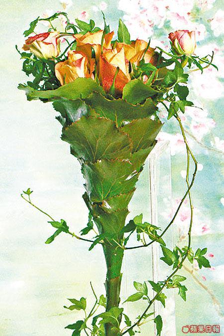 用上大、小玫瑰伴以長春藤,花莖用加力士葉重重包圍,如一朵出眾的花朵正盛放着,與眾不同。(最少四日前預訂,只限做三束)