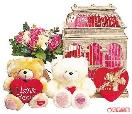 十一支Aqua紫玫瑰、黃色馬蹄蘭、一對CutieBearBear熊、朱古力、心意卡,還有滿載心形波波的小屋,將所有要送的一次過送贈,萬無一失!(最少四日前預訂)