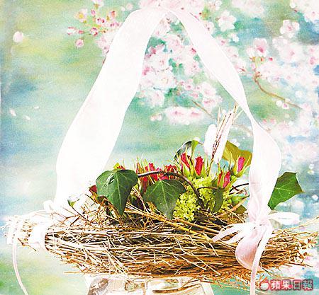 用小金竹自製成有如雀巢的小盆,再放上小玫瑰、繡球花、長春藤等植物,充滿藝術風格。(最少四日前預訂,只限做三束)