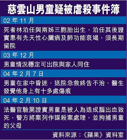 疑遭虐殺男童林泊任,兩歲零三個月大,父親三十六歲,母親三十歲,育有兩女一男三胞胎,死者是三弟,一家人同住慈雲山慈康邨健康樓一單位。據說,泊任的兩名孿生胞姊都健康良好,但他則患有先天性心臟病及肺功能衰竭,出生後便長期在醫院留醫,直至一個多月前才出院回家,但仍須定時服藥及覆診。