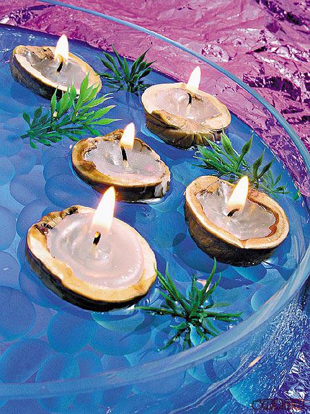 相比起普通蠟燭,點上浮水蠟燭,其搖曳的燭光令進餐時倍添浪漫!而且材料亦獨特,利用合桃殼作燭台。完成一個個浮水合桃蠟燭後,只需利用透明魚缸之類,加點水並置於其上,燃點蕩漾燭光,真係夠晒特別!