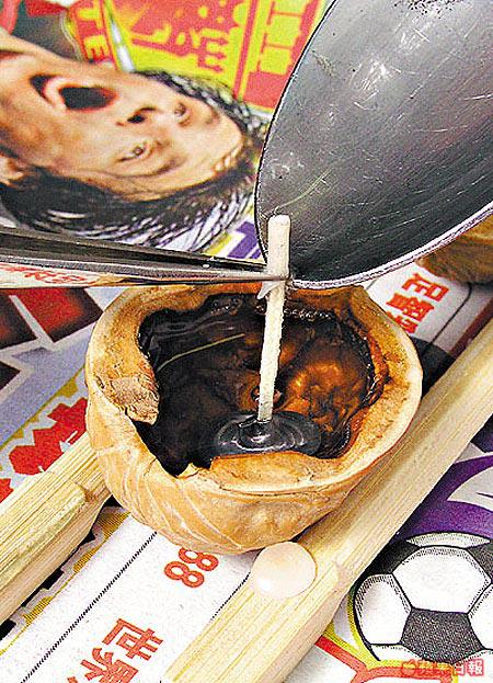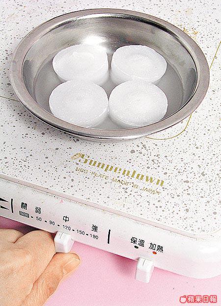 以中或小火便能將蠟煮溶;此外,為免合桃左右移動,倒蠟液時,可以筷子放在合桃兩邊以固定位置,同時緊記浮水蠟燭要遠離易燃物品,注意安全。