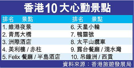 旅發局舉辦網上投票,由網友選出香港十大心動的景點,當中排名第一的屬於維多利亞港夜景,第二及第三名分別是青馬大橋、洲際酒店,其他依次分別是赤柱的美利樓等(見表)。